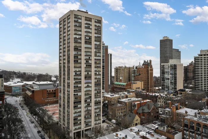 High-floor CORNER living with sweeping south and east skyline views in the heart of Old Town. This spacious corner one-bedroom plus den residence at Bryant House offers a rare layout, abundant natural light, and a thoughtful blend of original upgrades and recent improvements, including fresh paint, hardwood flooring throughout, crown molding, and an oversized private balcony perfect for enjoying expansive city views. Wraparound windows with south and east-facing exposures feature premium Hunter Douglas automatic blinds and fill the home with sunlight throughout the day, while the open living and dining area easily accommodates everyday living and entertaining. The kitchen features custom cabinetry, granite and quartz surfaces, a full-height glass-and-stainless backsplash, under-cabinet lighting, stainless steel appliances, including a dual-zone wine fridge, a deep corner sink, and a generous six-foot breakfast bar, with a separate dining area option as well. The large bedroom comfortably accommodates a king-sized bed and features ample closet space, complemented by additional storage throughout the home, enhancing functionality. A dedicated den/office with custom shelving and a barn door provides ideal work-from-home flexibility rarely found in one-bedroom units. The updated bathroom maintains a clean, timeless feel. Monthly assessments include heat, cable, and high-speed internet (1GB), with only electricity billed separately, and the well-managed, FHA-approved building offers 24-hour door staff, fitness center, rooftop sundeck, bike room, additional storage included, attached garage parking available for rent, and access to Sandburg Village amenities including two Olympic-sized heated pools, tennis and pickleball courts, and landscaped courtyards (fees apply). Just steps from public transportation, Lake Shore Drive, the lakefront trail, Old Town, Lincoln Park, dining, shopping, nightlife, and Jewel-Osco, with professional on-site management and pet-friendly living.